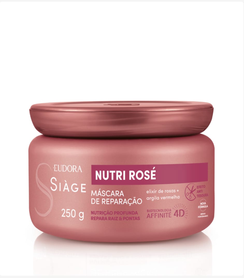 A linha Siàge Nutri Rosé é enriquecida com um poderoso Elixir de Rosas, rico em vitaminas e antioxidantes que nutrem os fios e tem alto poder de reparação, combinado a natural Argila Vermelha que nutre os fios, promovendo equilíbrio ao couro cabeludo e reparação profunda da raíz às pontas.